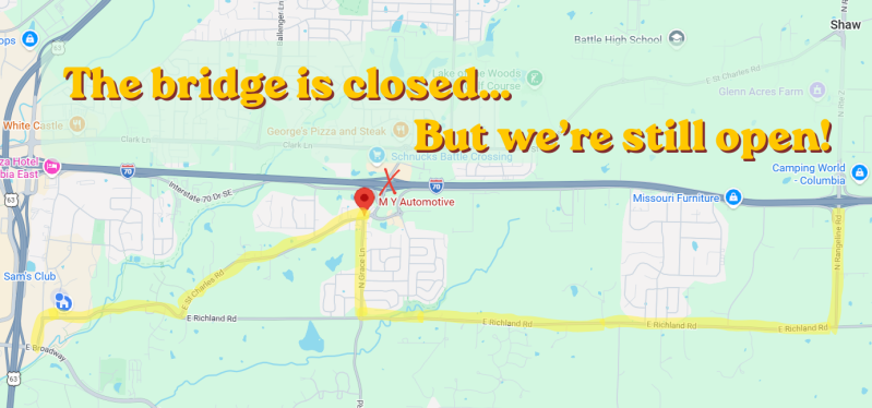 Please note: The bridge at St. Charles Road and 70 is closed to accommodate the I-70 expansion, but we're open and there are still several convenient ways to reach us!